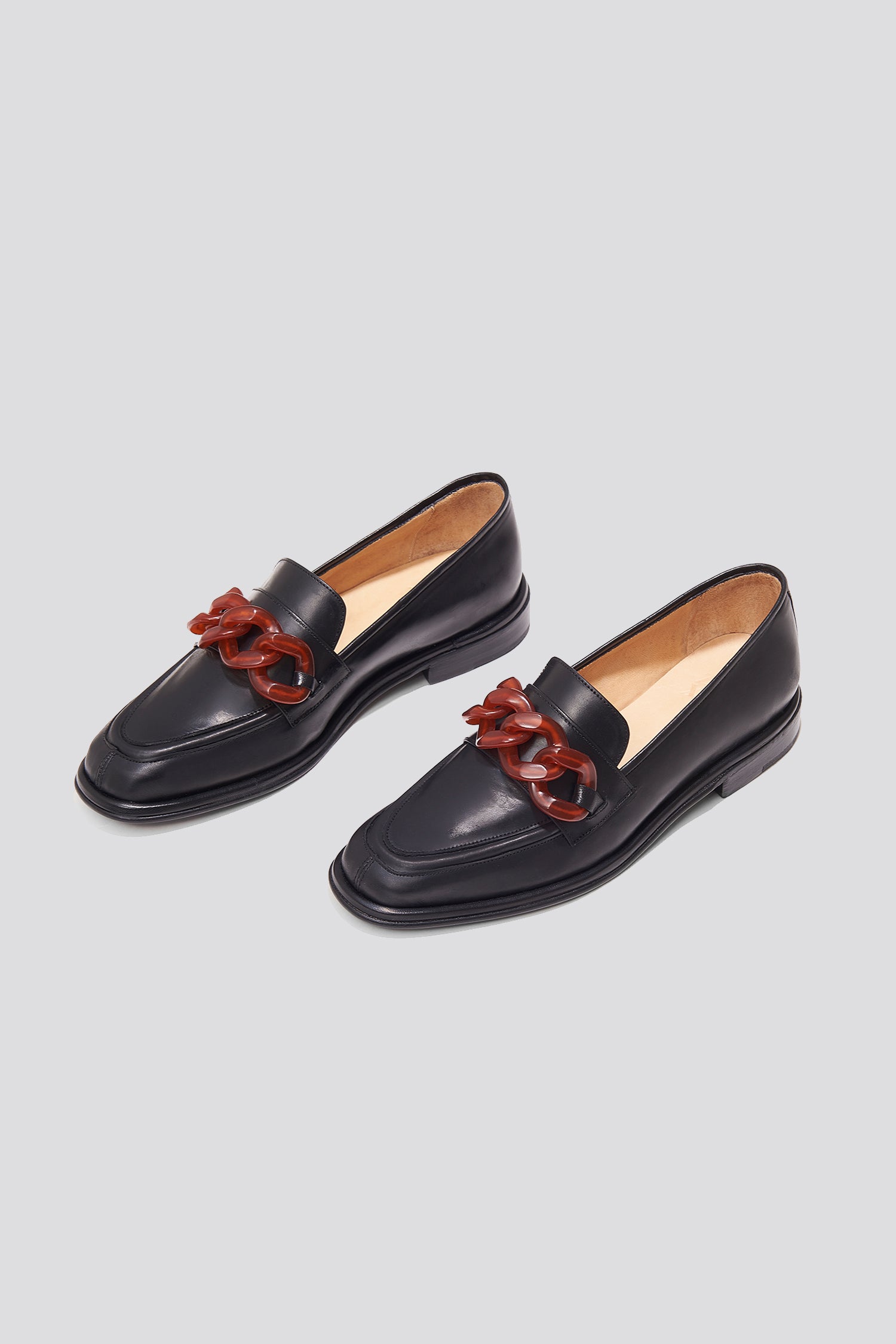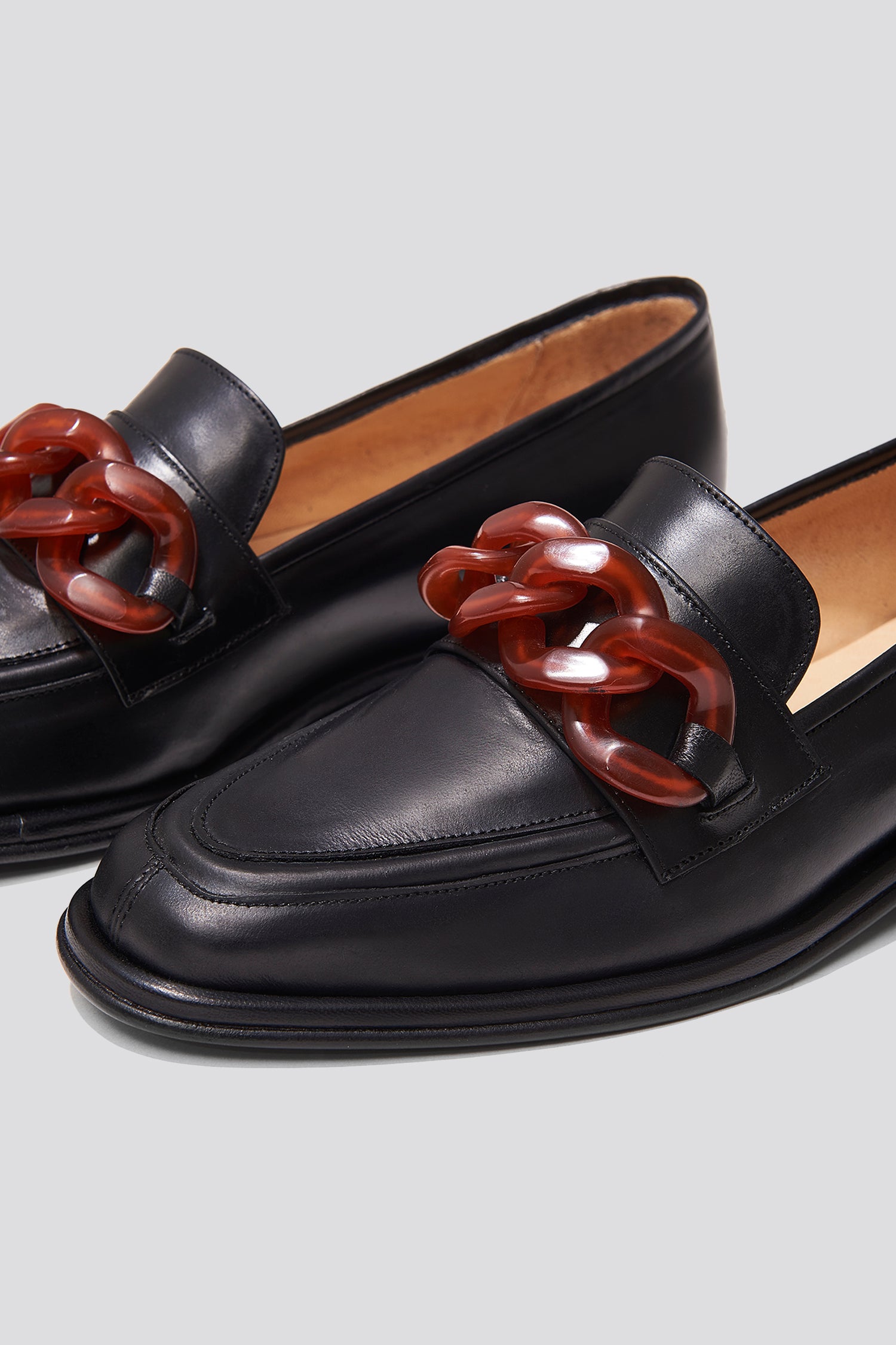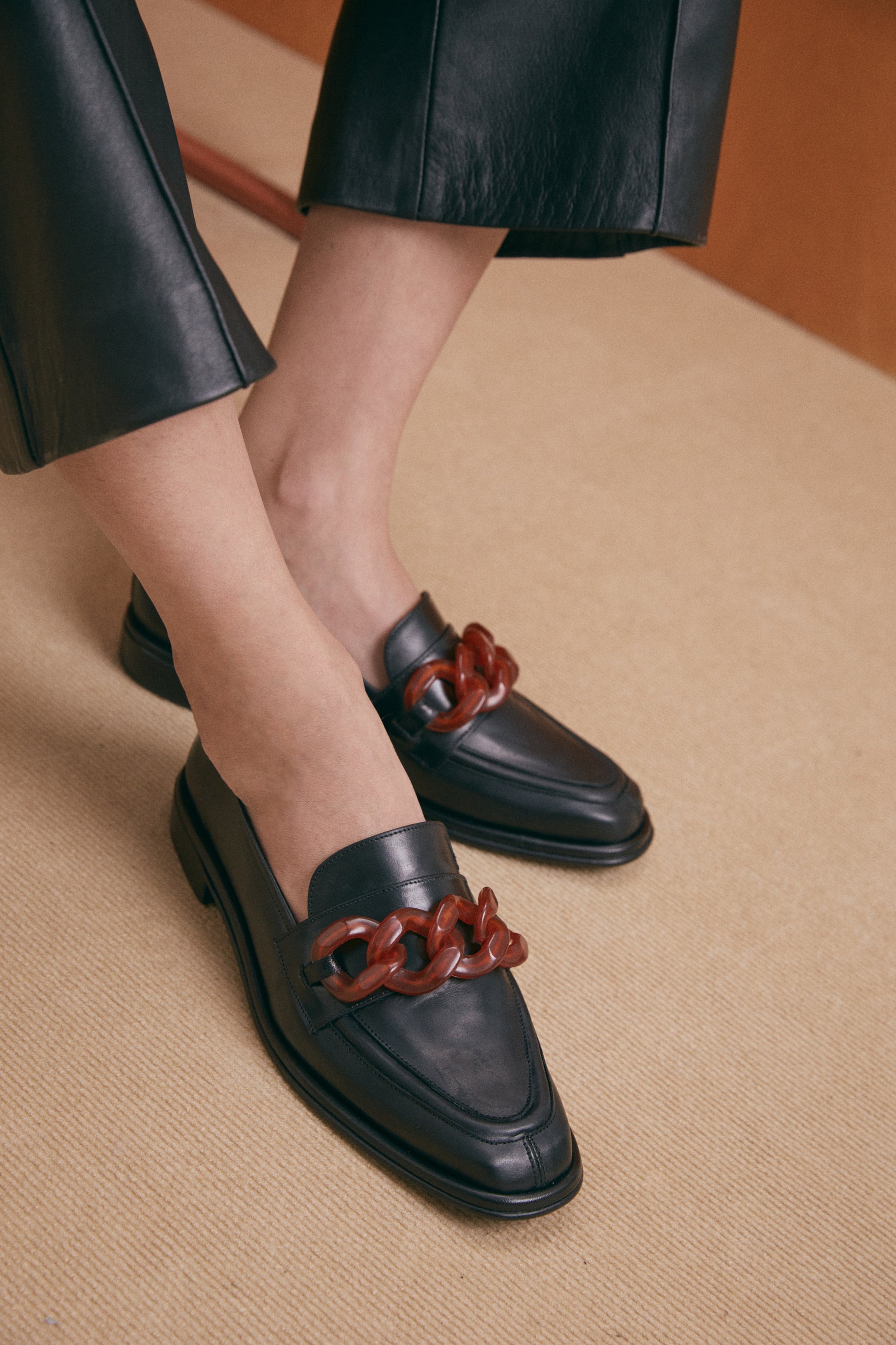 Kidskin leather upper with vegetable tanned leather lining and acrylic chain detail