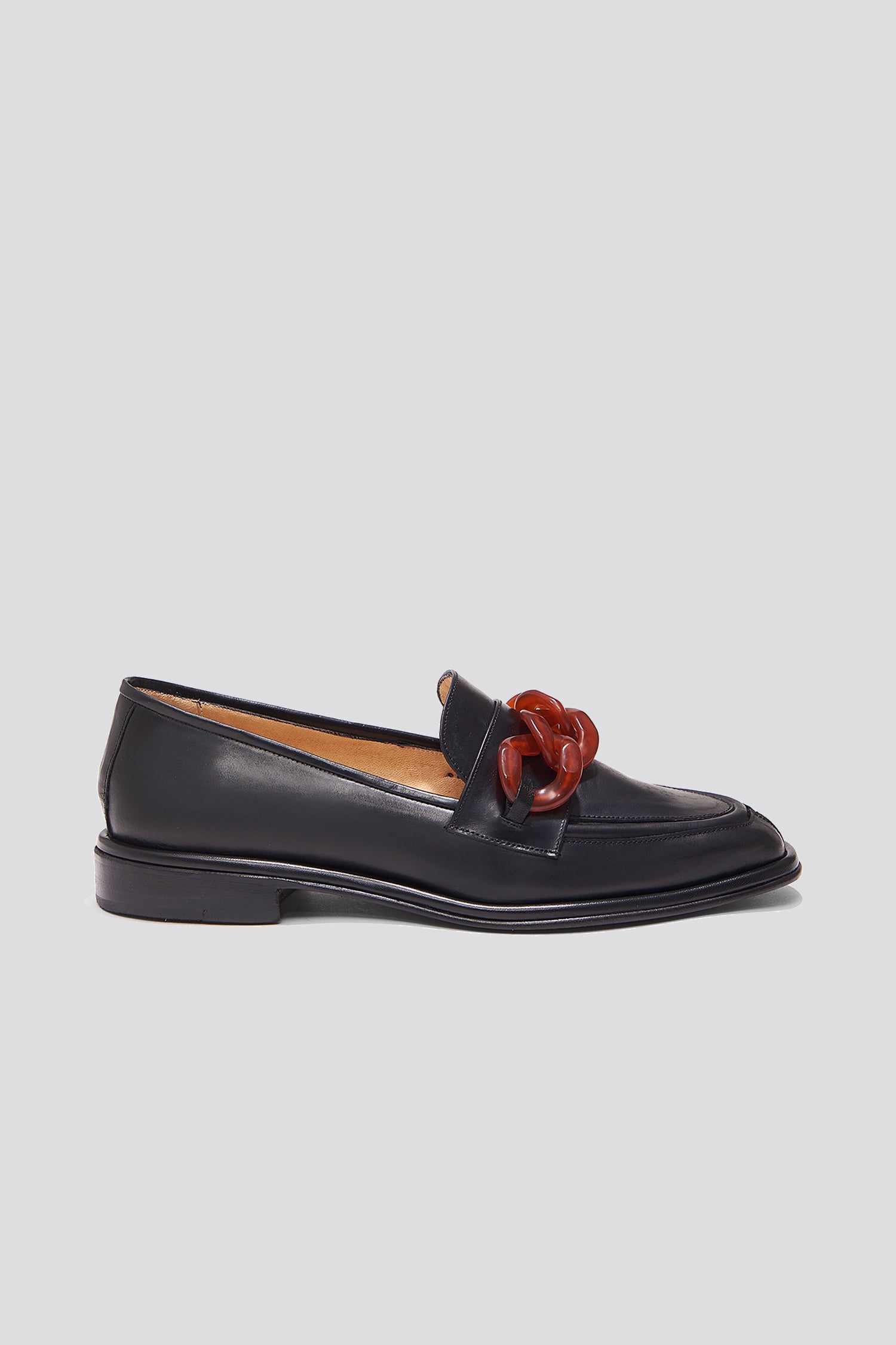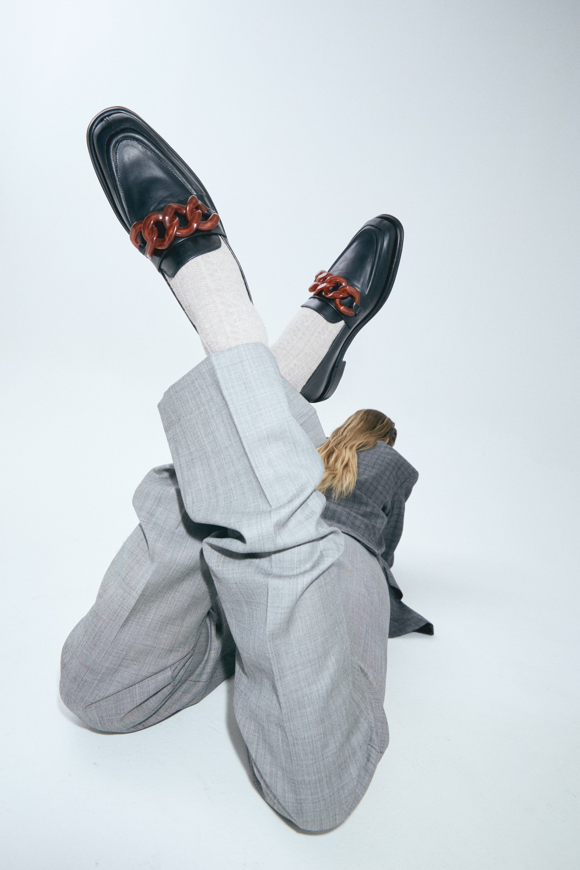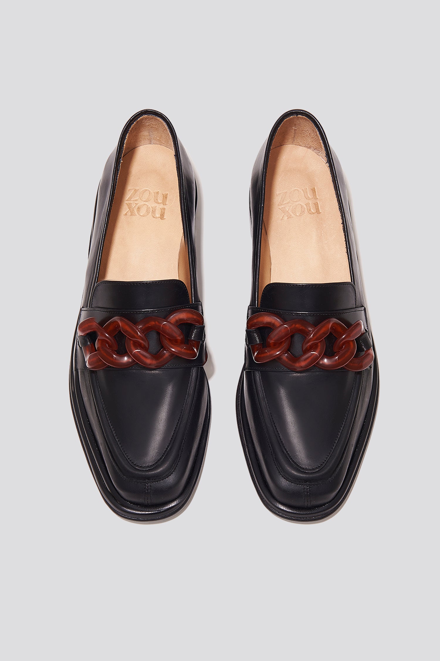 Kidskin leather upper with vegetable tanned leather lining and acrylic chain detail
