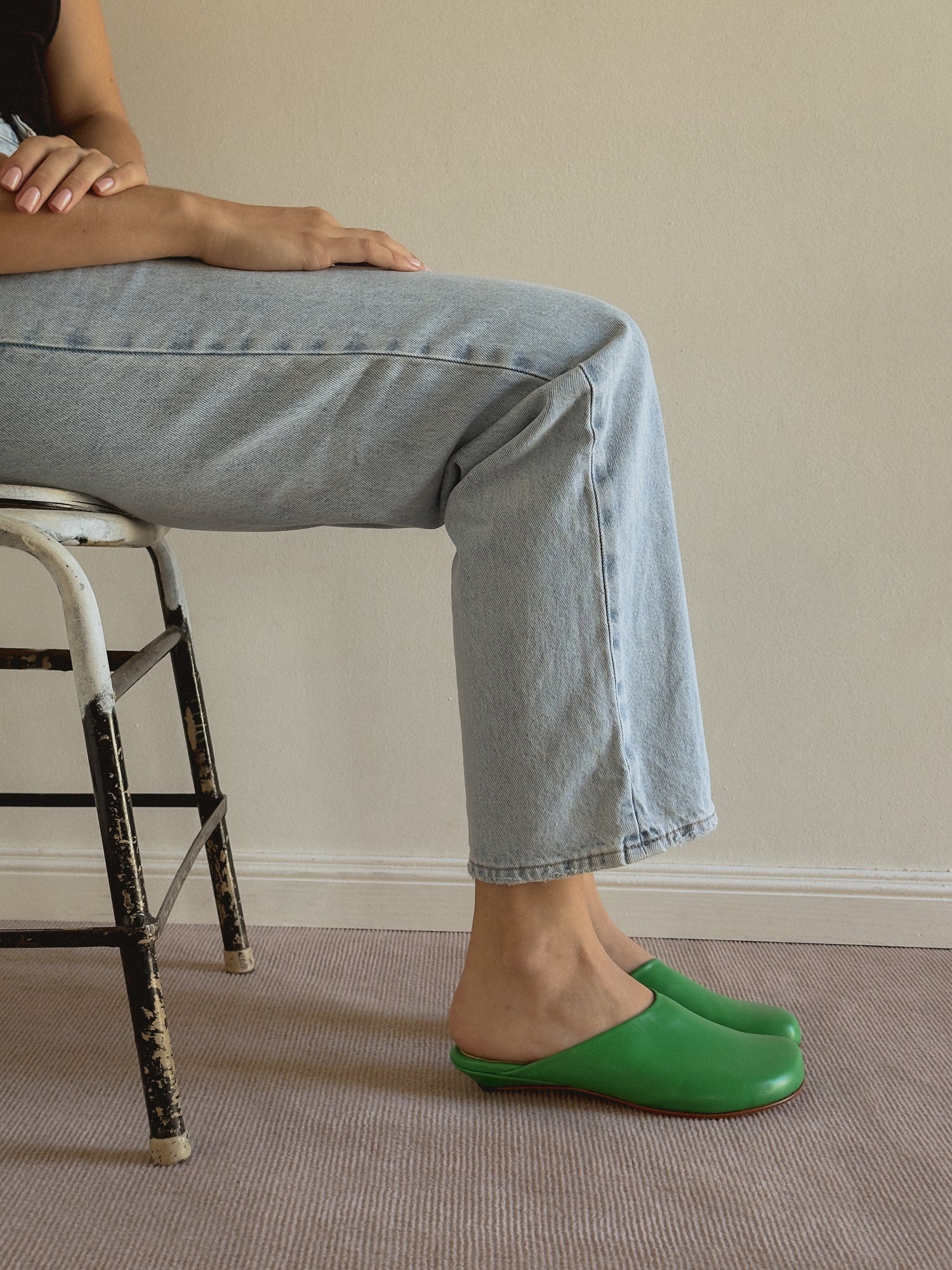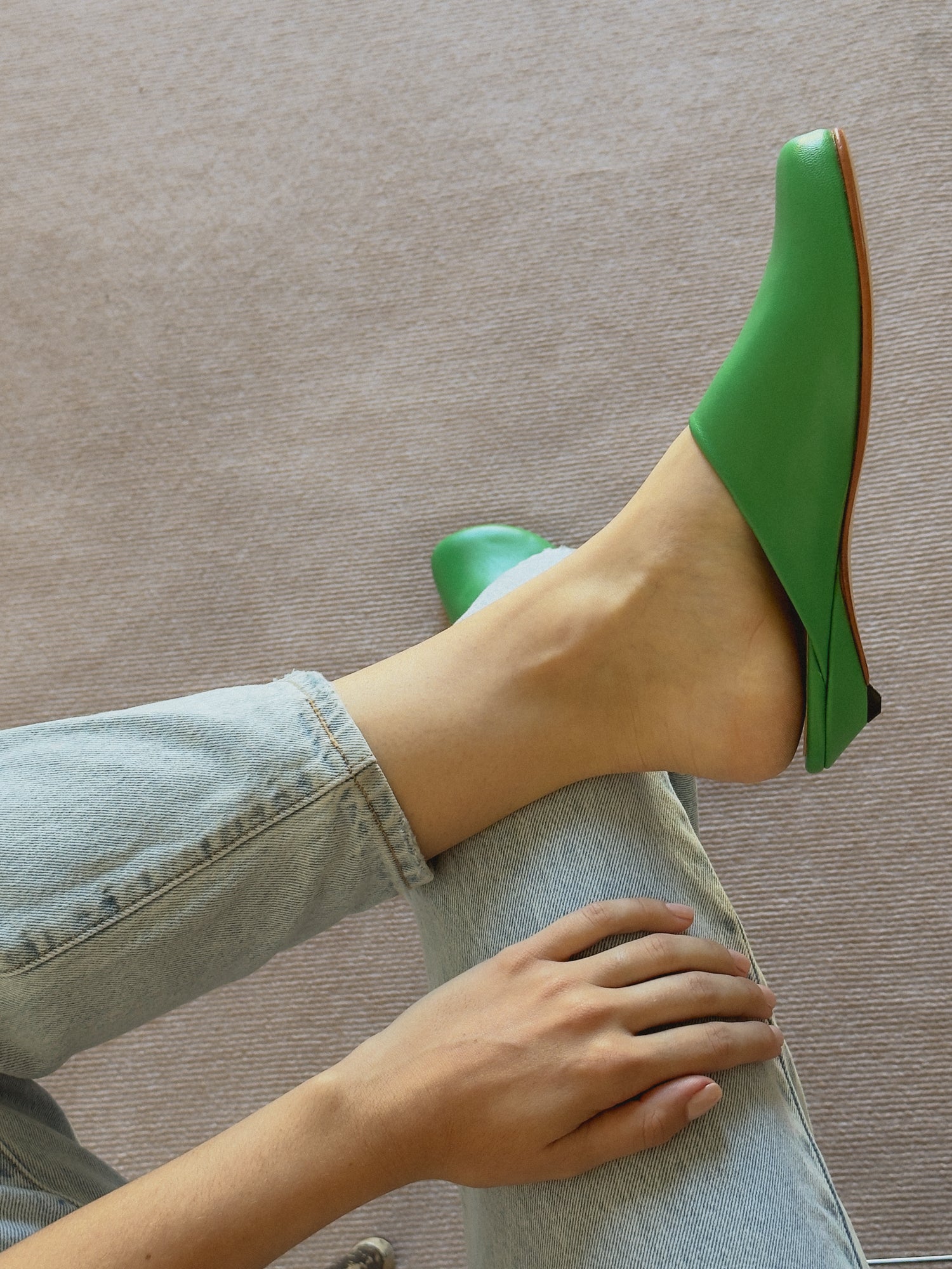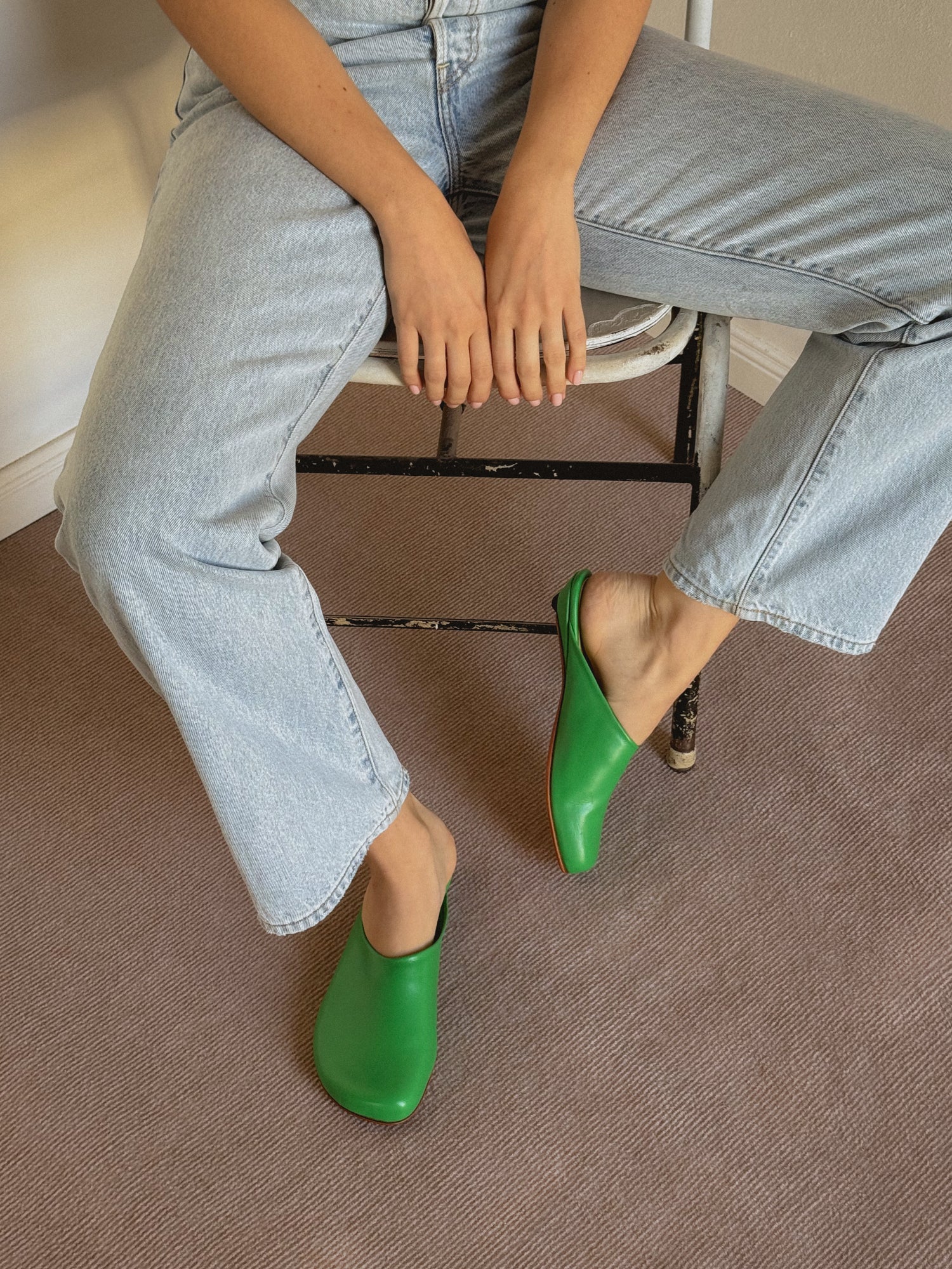 The Charo is our elevated take on a comfort classic. This slip-on leather clog features a wide toe box and a subtle 1-inch mini wedge heel that adds just enough lift without sacrificing ease. In Grass—a bold, bright green that energizes neutrals and plays well with warm-weather dressing—this version brings a playful edge to a practical shape.