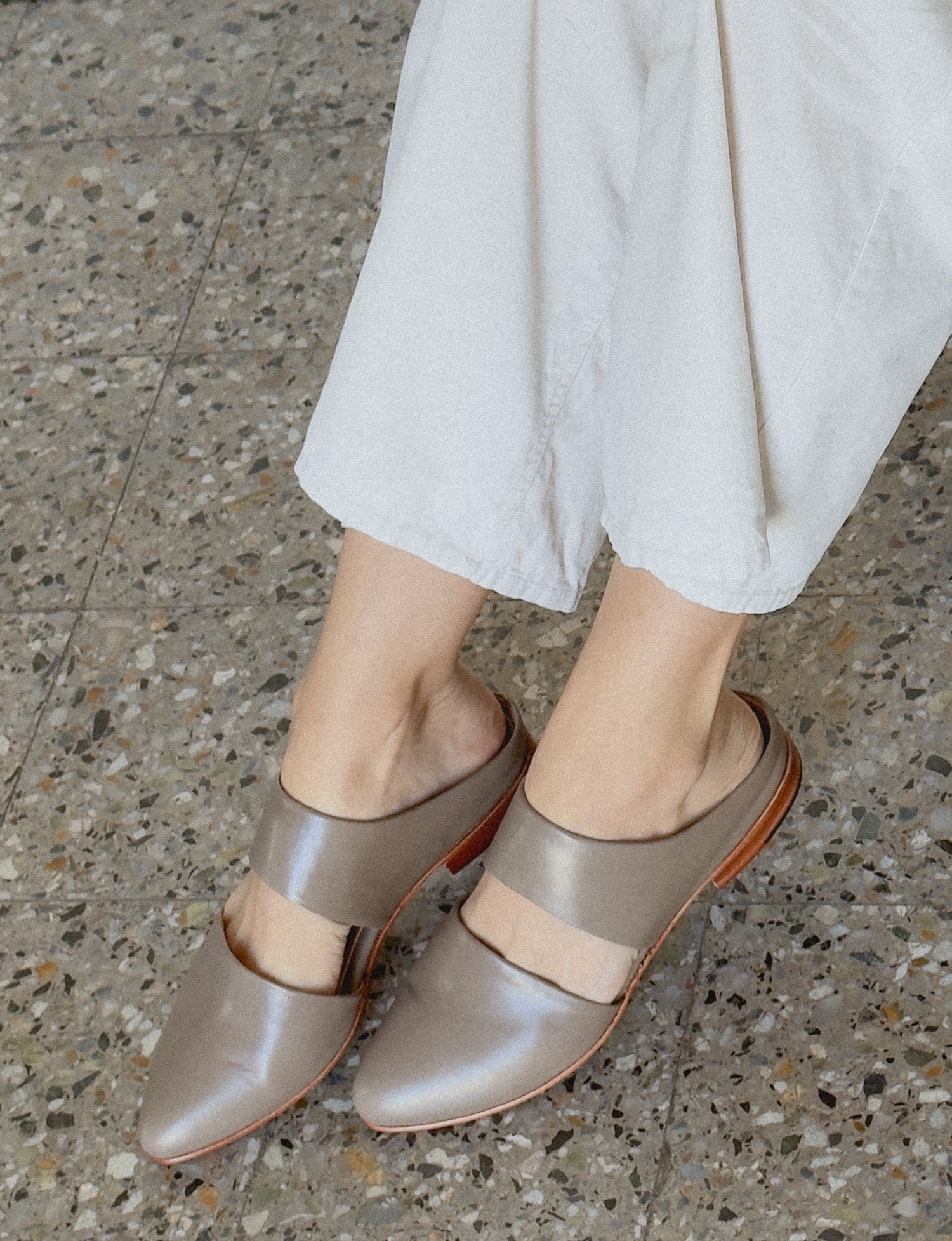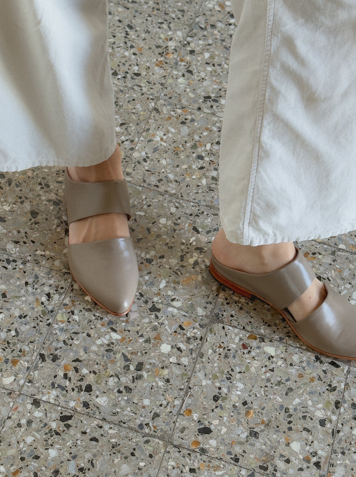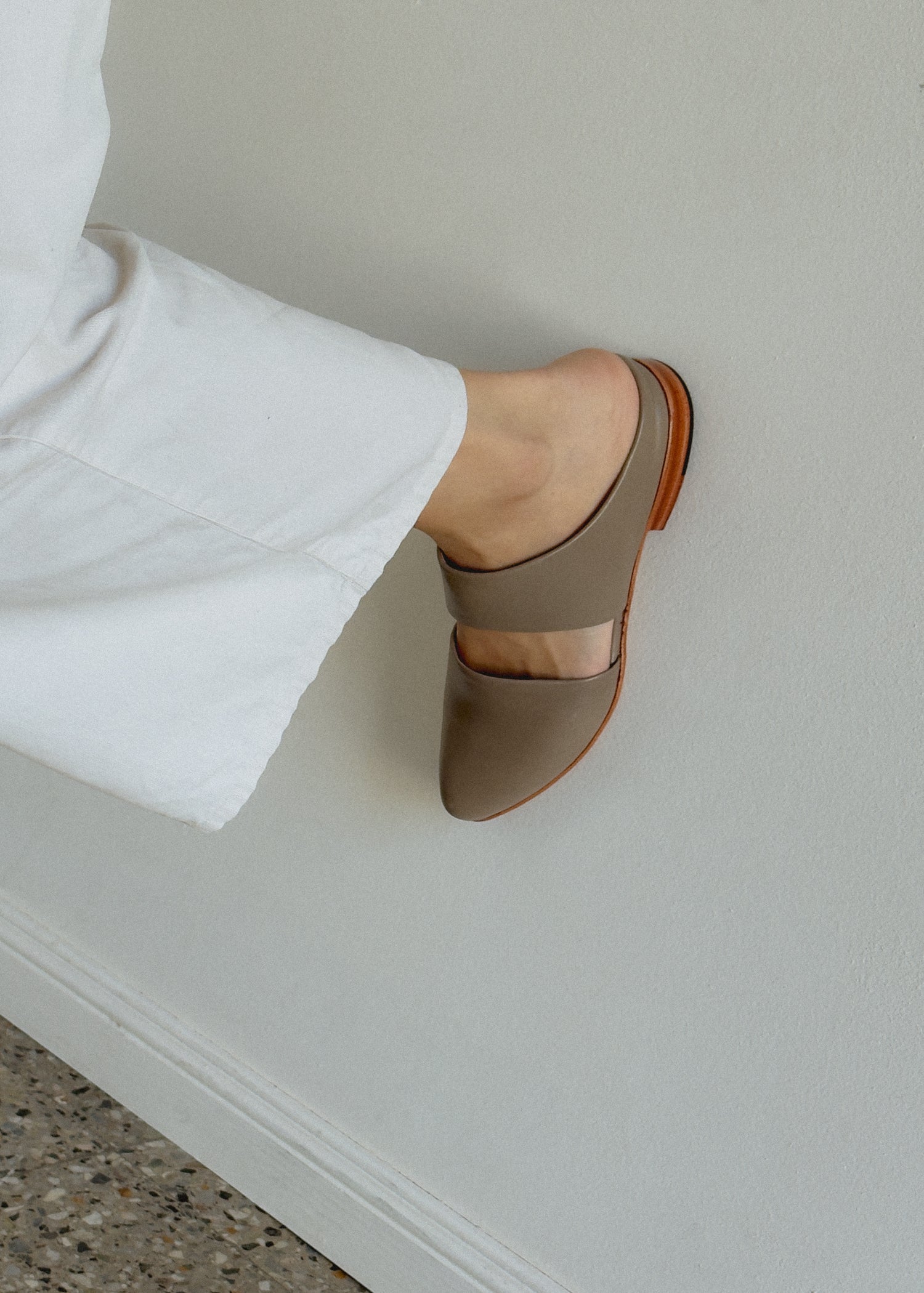 A modern take on the traditional babouche slipper, our signature flat mule is designed for ease, movement, and everyday wear. A sleek cut-out upper and almond-shaped toe create a silhouette that feels both considered and unfussy—ideal for days when comfort and movement go hand in hand. This pair is crafted in warm taupe kidskin that offers a subtle, interesting alternative to brown or black.