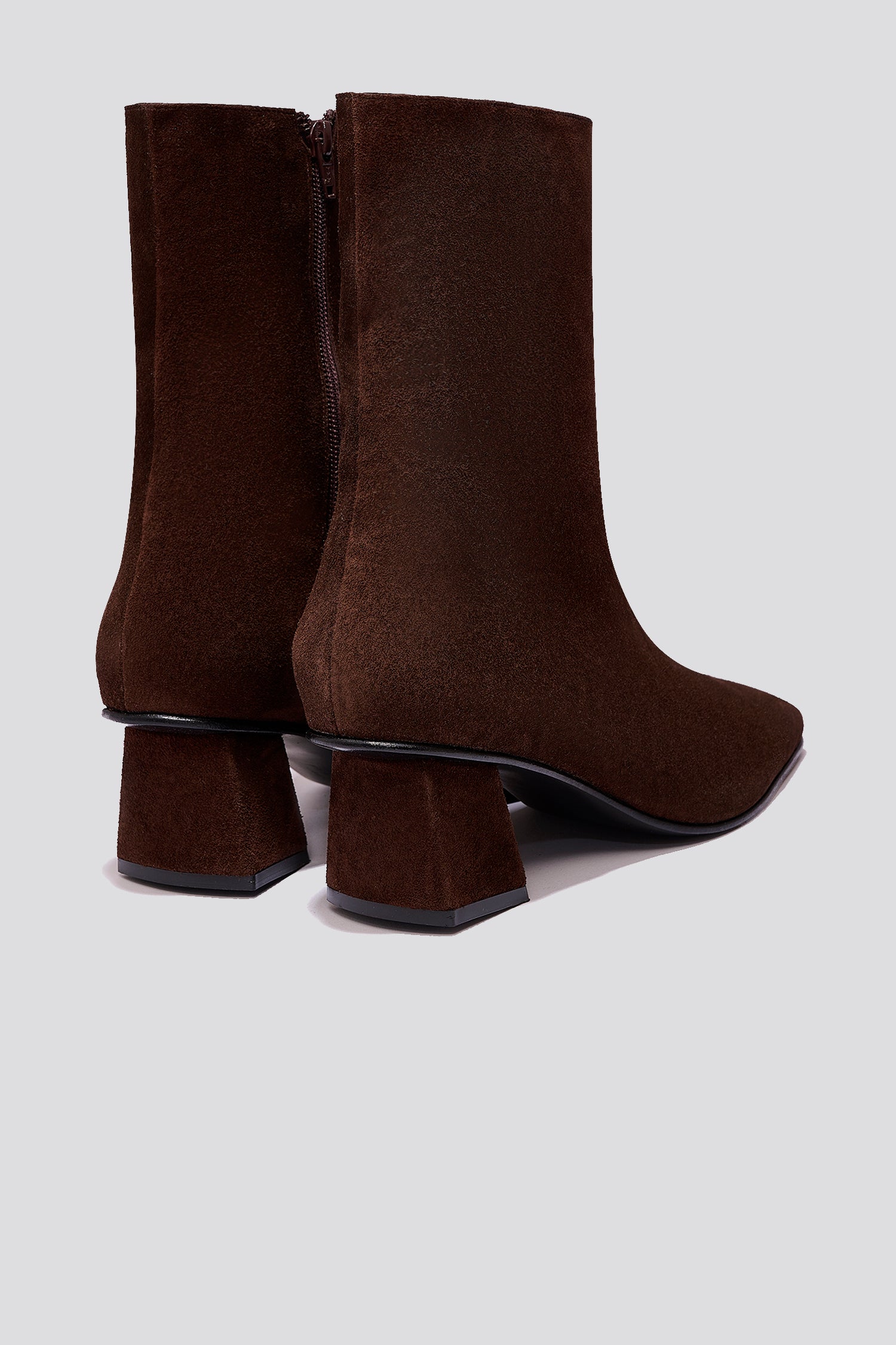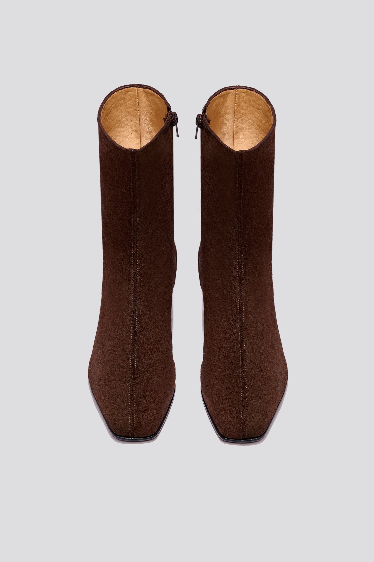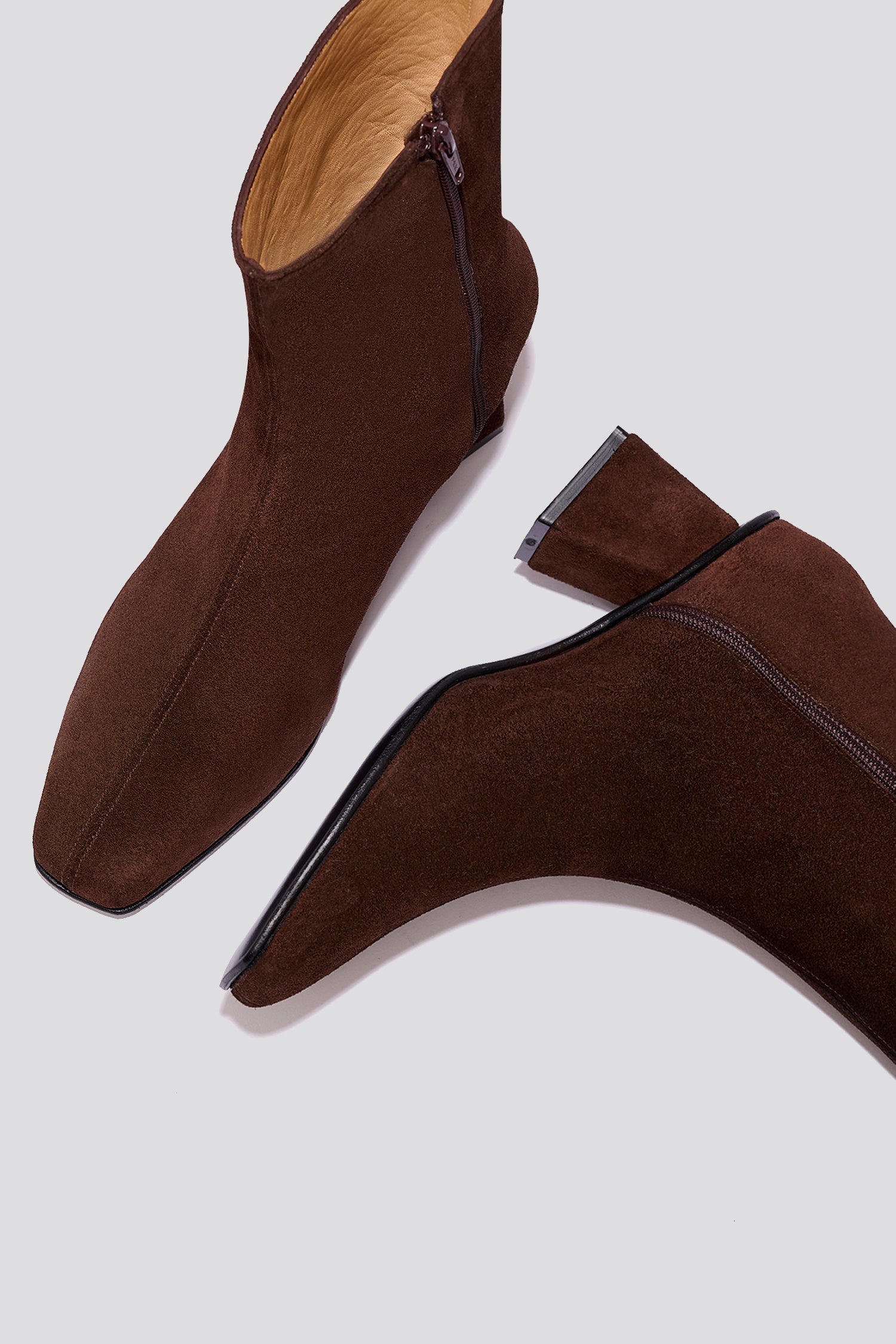 Split cow suede leather upper with vegetable tanned leather lining, a wrapped block heel, zipper closure and leather sole