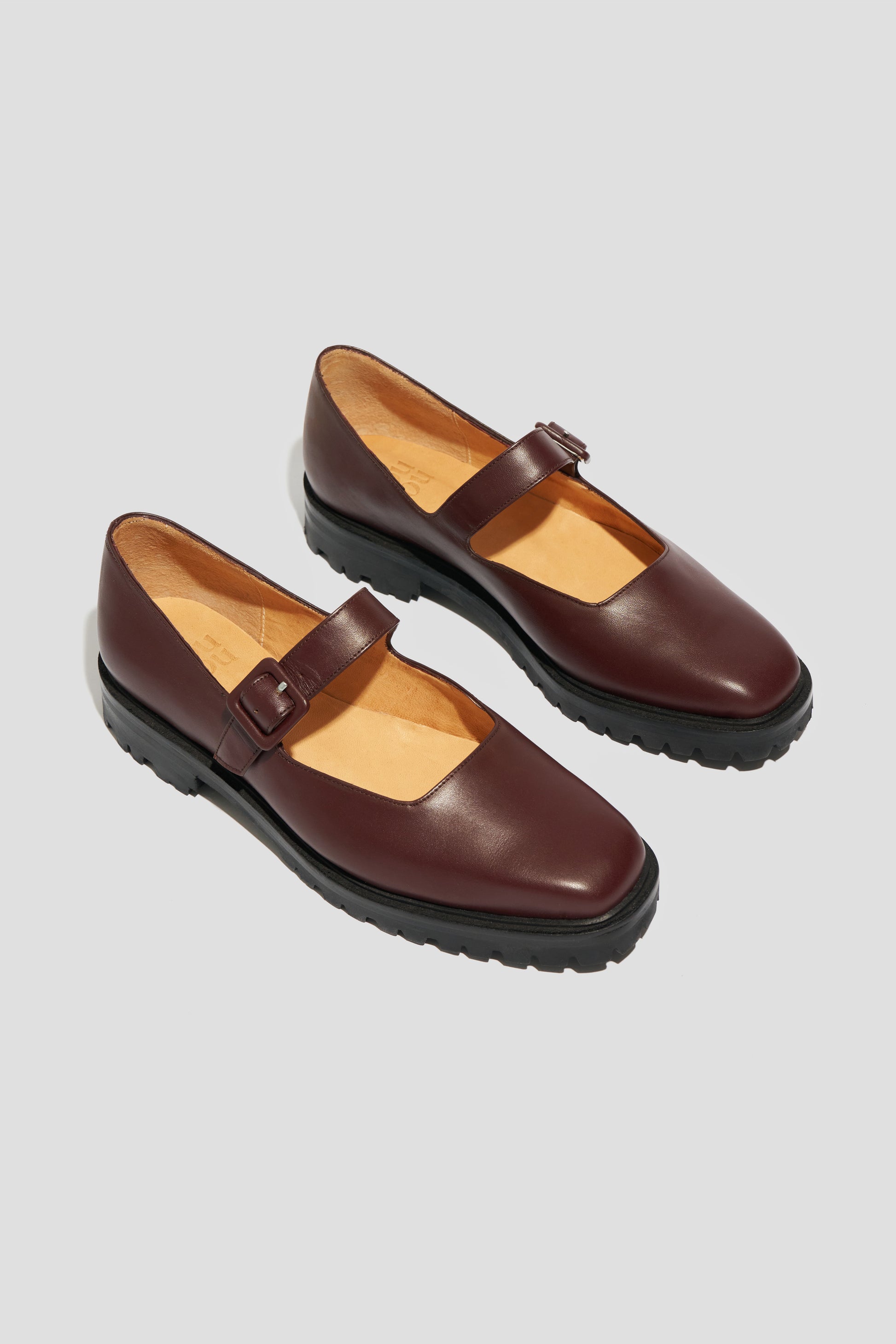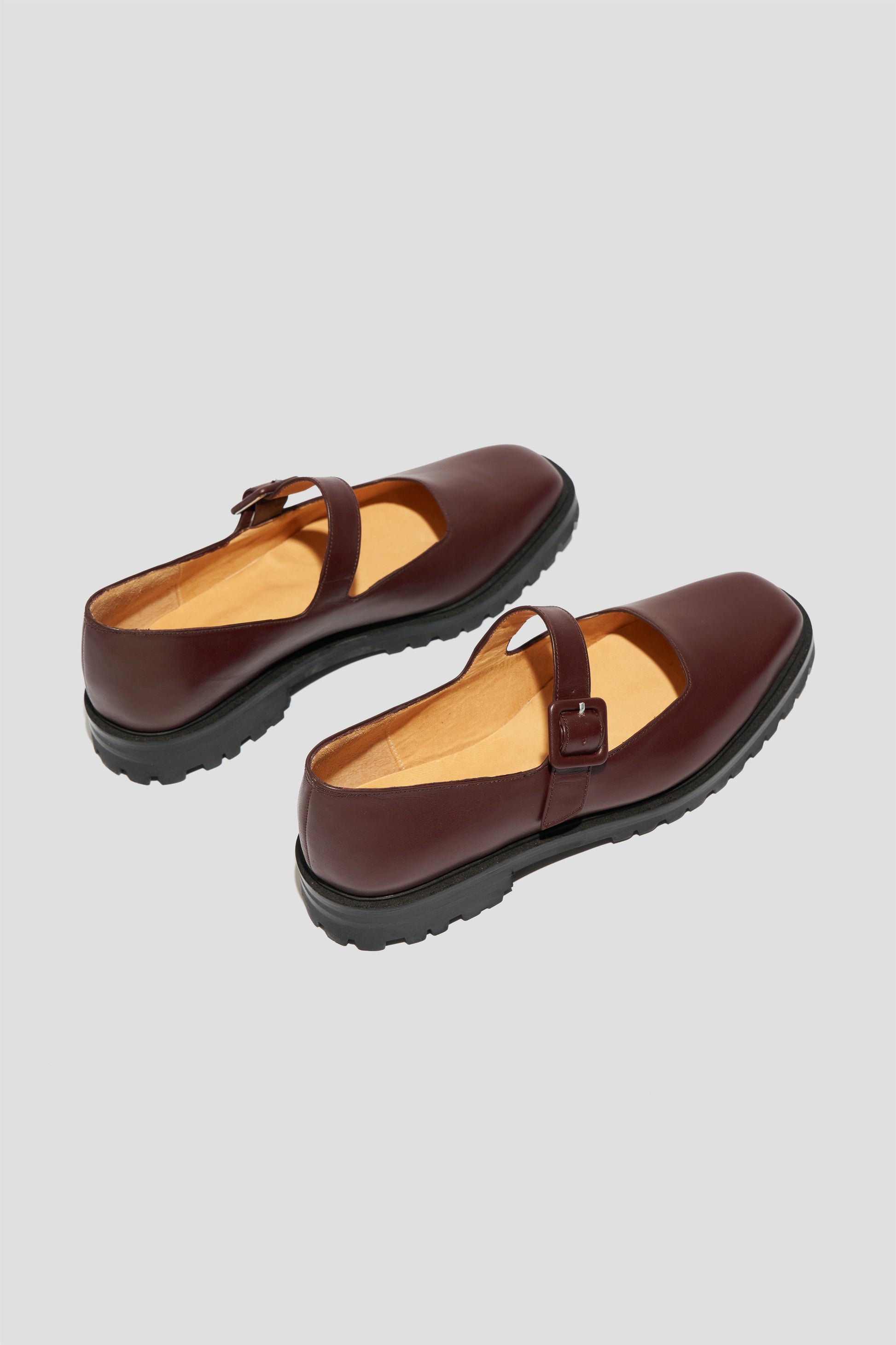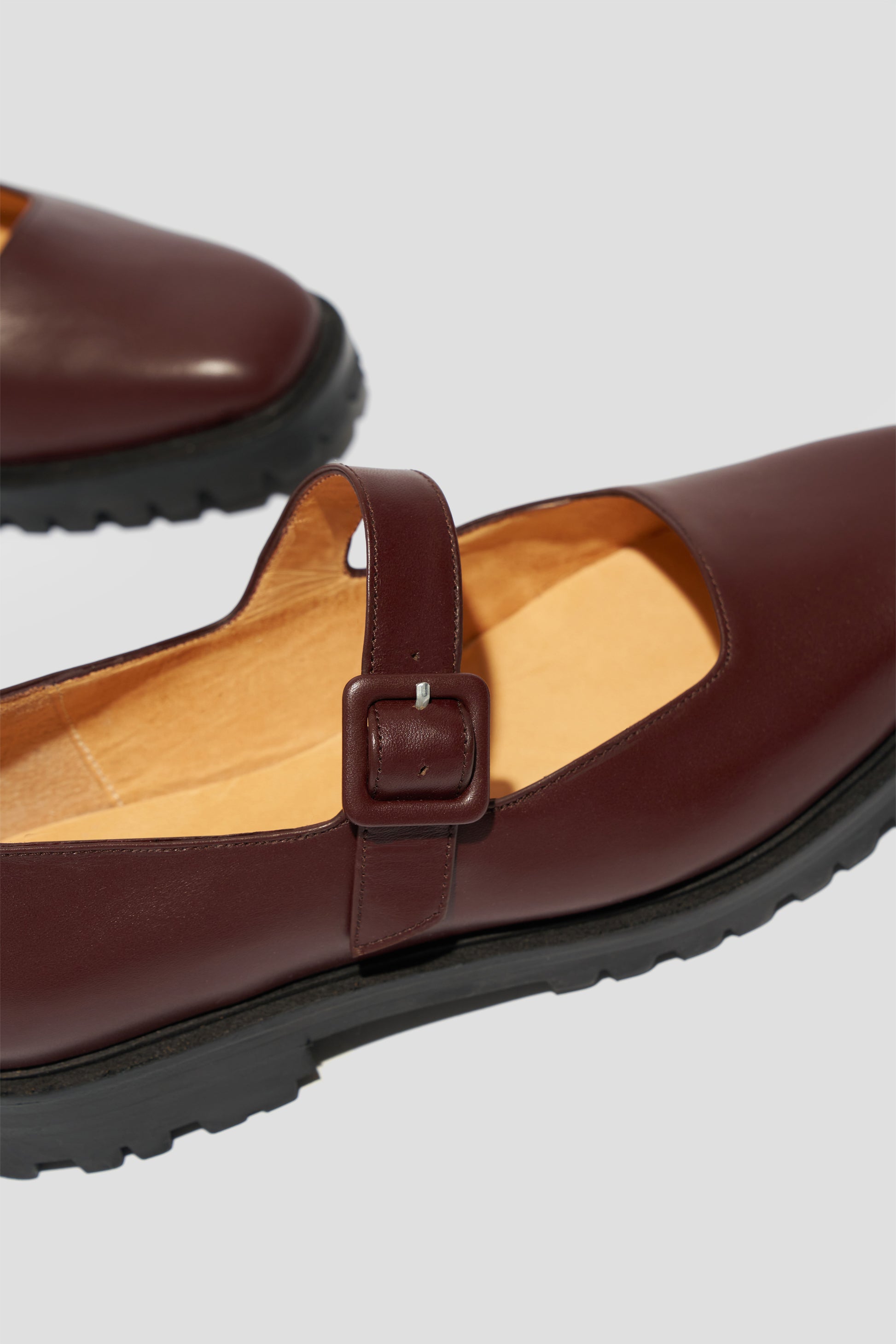 The Uchi Flat is a modern take on our bestselling Eugenia. Updated with a chunky leather and rubber lug sole and a matching leather-covered buckle, it offers a streamlined silhouette with added edge. Crafted in deep burgundy leather, it strikes the perfect balance between bold and refined.