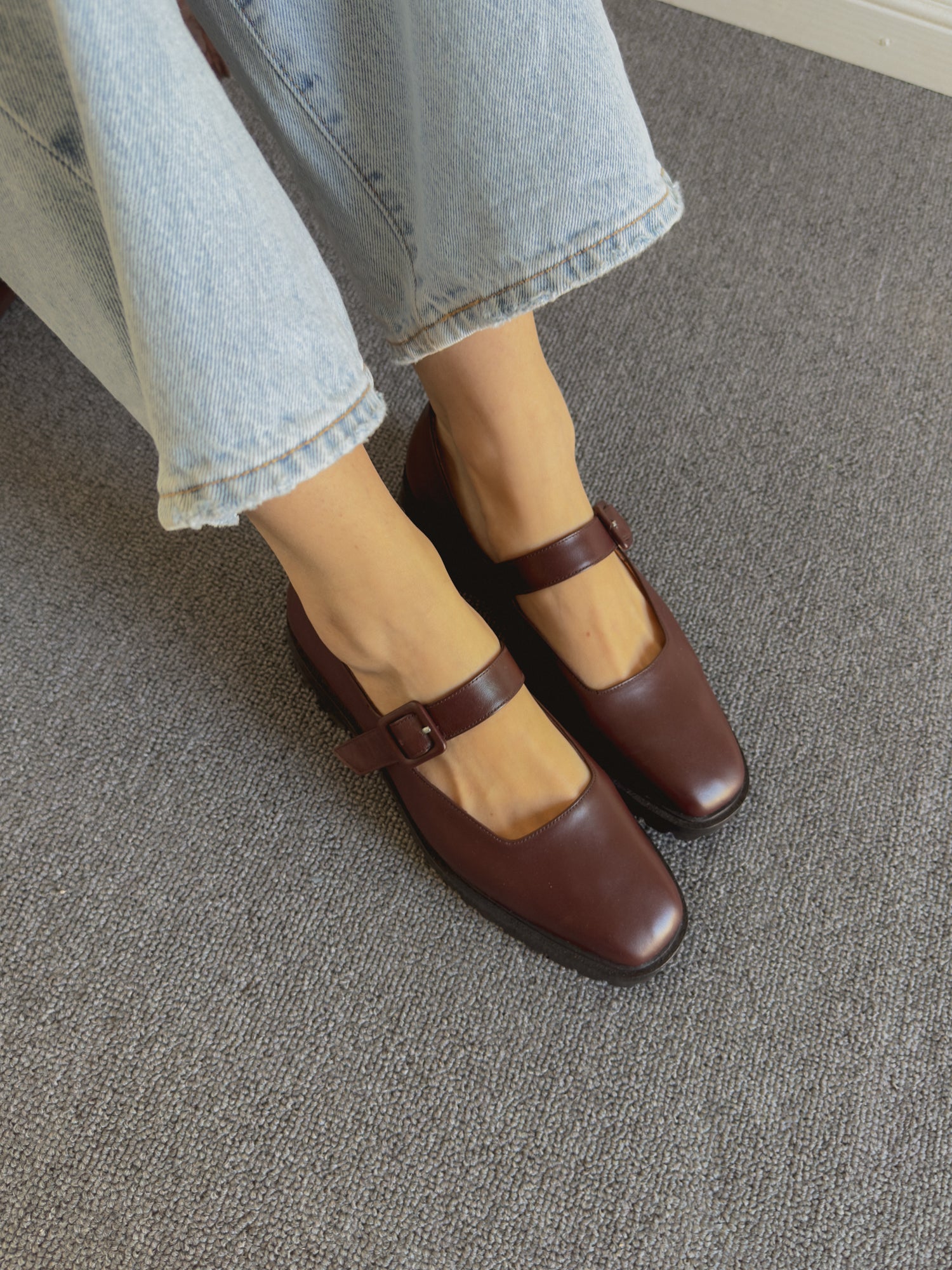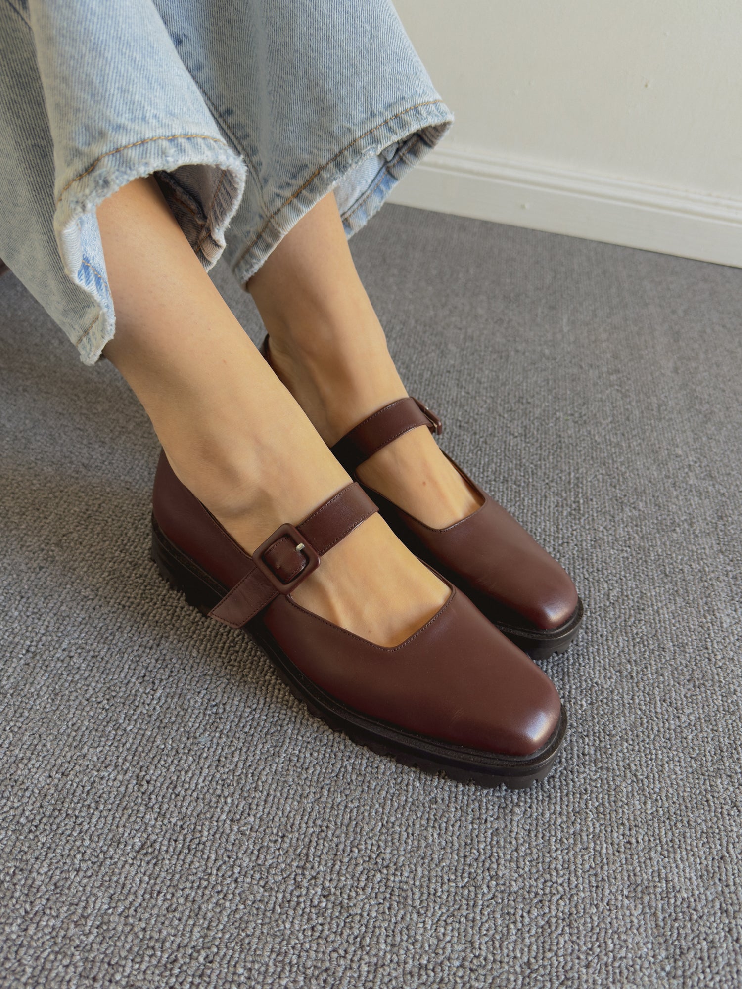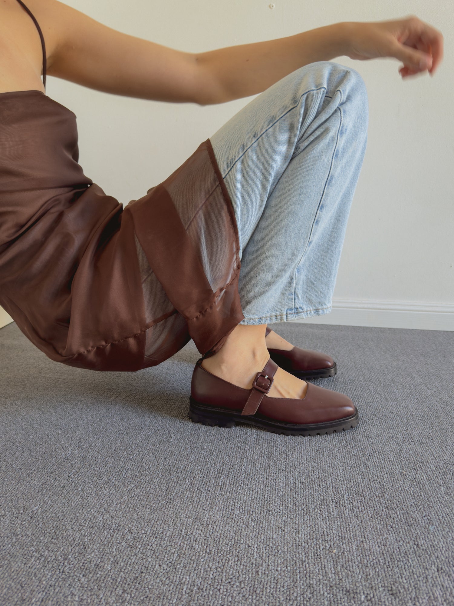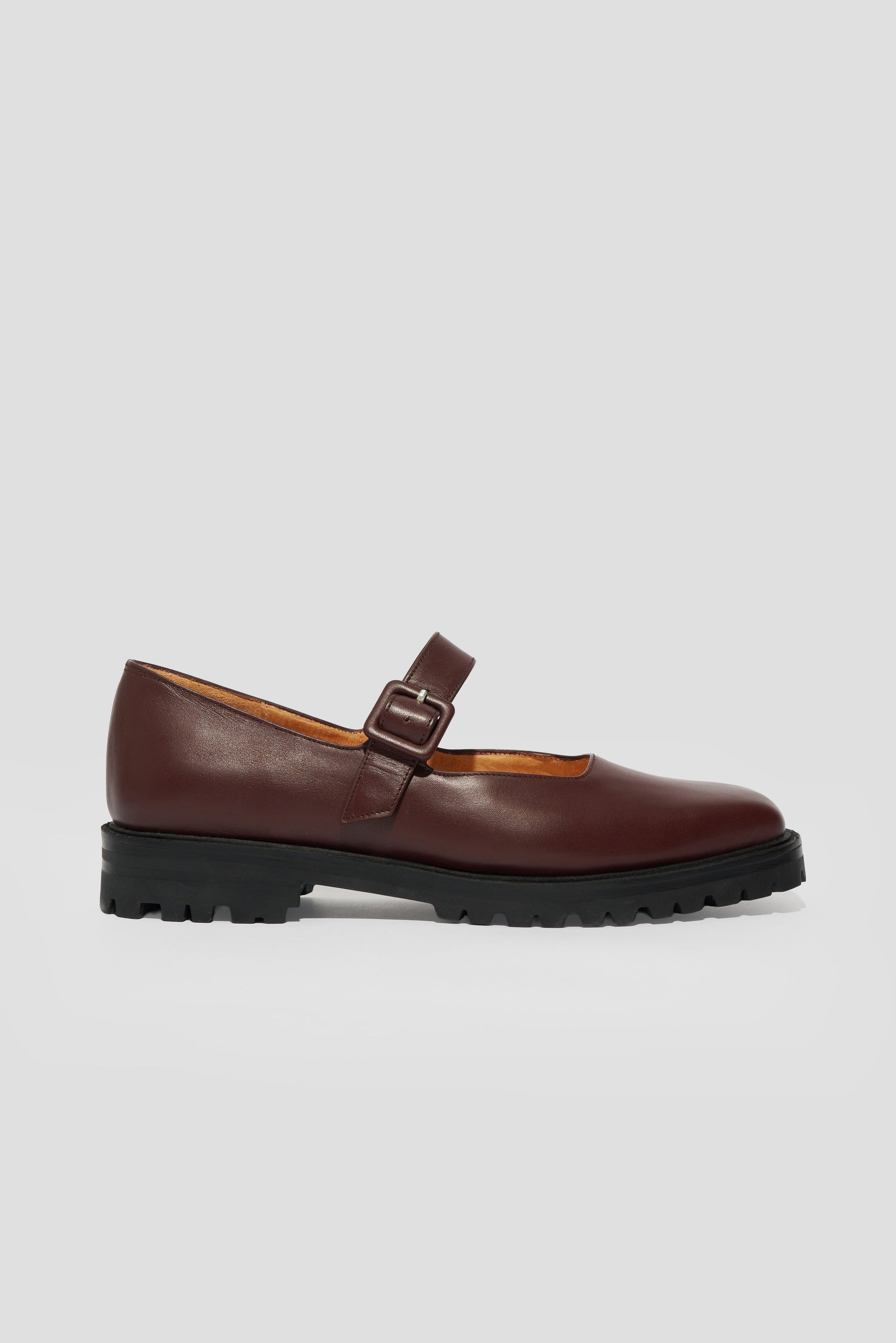 The Uchi Flat is a modern take on our bestselling Eugenia. Updated with a chunky leather and rubber lug sole and a matching leather-covered buckle, it offers a streamlined silhouette with added edge. Crafted in deep burgundy leather, it strikes the perfect balance between bold and refined.