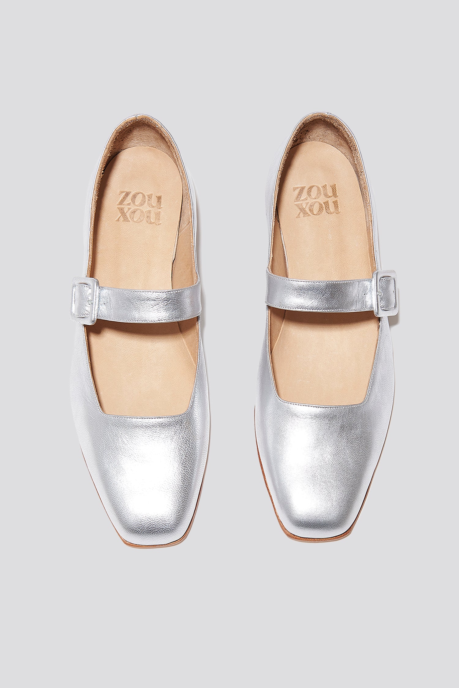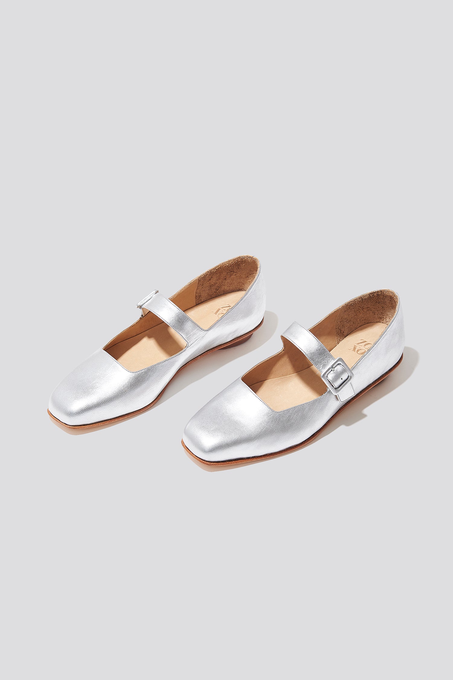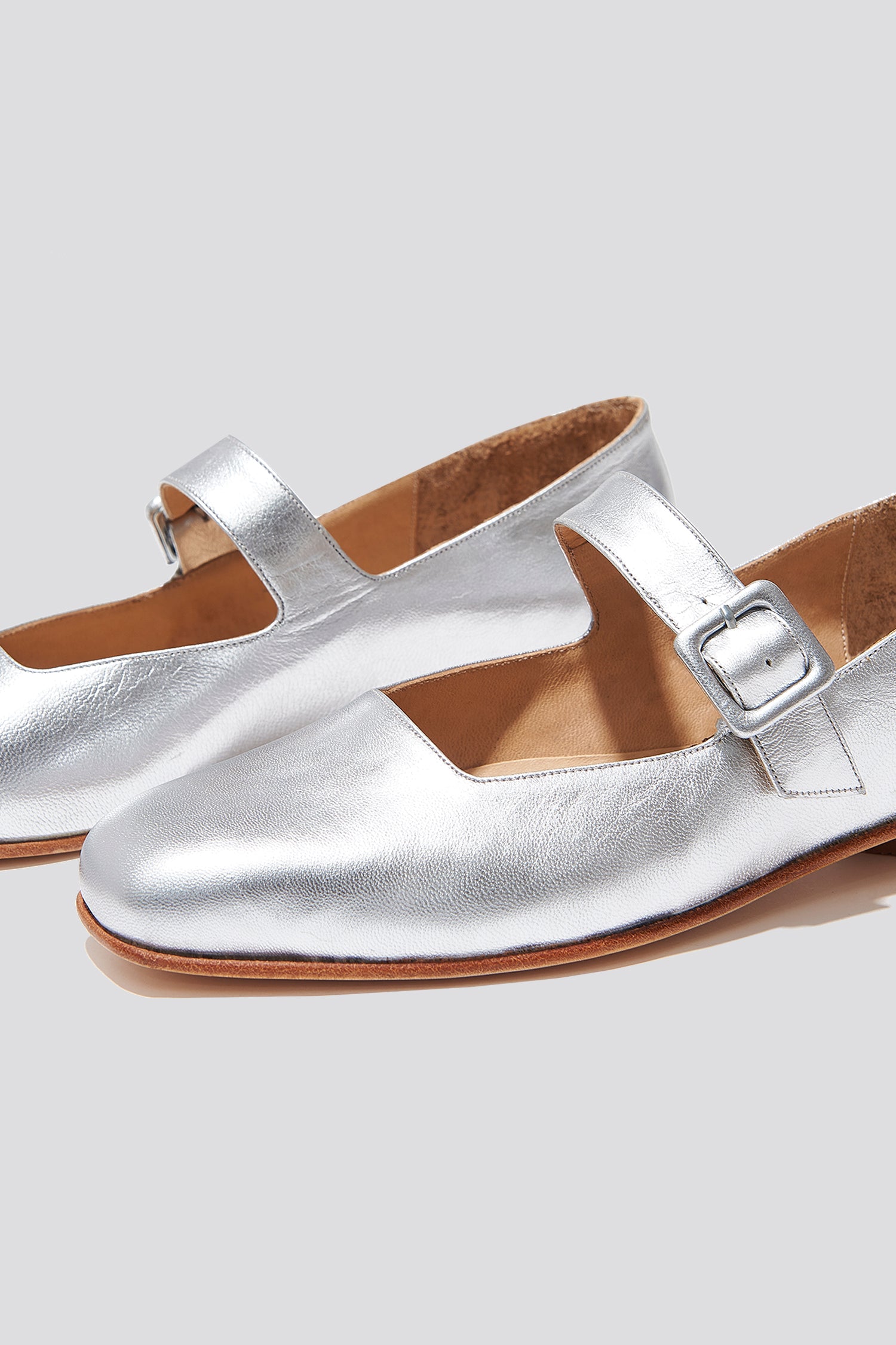 The Eugenia Flat is a modern interpretation of the classic mary jane flat featuring a square toe, angular topline and oval-shaped heel. This pair is crafted from metallic silver kidskin leather and a matching buckle.